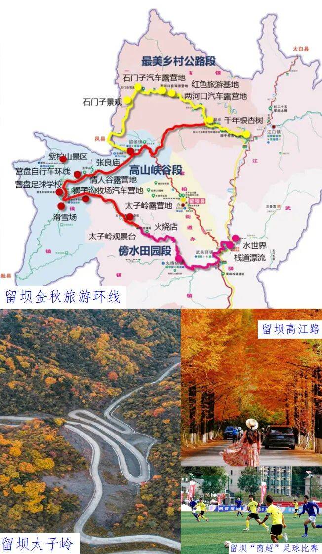 特色:此环线起于“最美乡村公路”高江路,经国道316、国道244,县道狮太路,止于武雪路,全程171公里。2022年获得中国体育旅游精品线入选交通运输部“全国十大最美自驾路”。可前往江口镇欣赏传统的“晒秋”景观,沿高江路感受金色长廊的魅力,感受自驾的惬意。到情人谷,欣赏秀美的山水风光,享受宁静的自然氛围,在紫柏山和太子岭观赏漫山遍野的红叶,仿佛置身于油画之中。探访狮子沟牧场,可看牛羊悠闲吃草,体验草原风情,在足球小镇踢会儿足球,感受小镇的运动氛围,4日至6日在县城公共体育举办陕西留坝·商会超级足球公益赛月冠军赛。