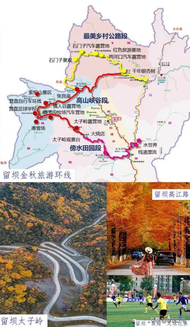 特色:此环线起于“最美乡村公路”高江路,经国道316、国道244,县道狮太路,止于武雪路,全程171公里。2022年获得中国体育旅游精品线入选交通运输部“全国十大最美自驾路”。可前往江口镇欣赏传统的“晒秋”景观,沿高江路感受金色长廊的魅力,感受自驾的惬意。到情人谷,欣赏秀美的山水风光,享受宁静的自然氛围,在紫柏山和太子岭观赏漫山遍野的红叶,仿佛置身于油画之中。探访狮子沟牧场,可看牛羊悠闲吃草,体验草原风情,在足球小镇踢会儿足球,感受小镇的运动氛围,4日至6日在县城公共体育举办陕西留坝·商会超级足球公益赛月冠军赛。