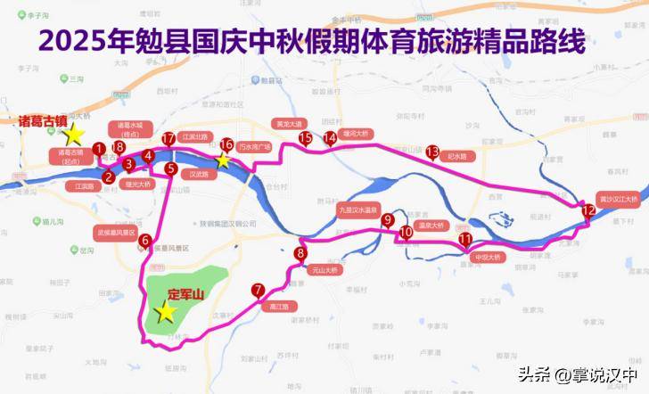 线路:勉县诸葛古镇()景区—江滨路—沔水湾广场—黄沙汉江大桥—九昱汉水温泉—定军山风景区—武侯墓风景区—沔水湾广场(江滨路)—诸葛古镇(诸葛街)景区,全程约38公里。