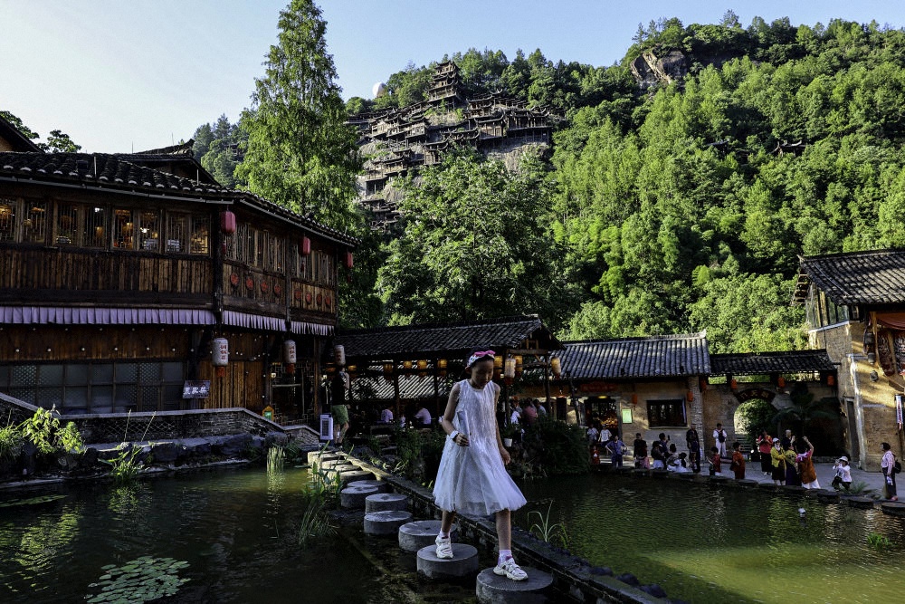 2025年7月11日,游客在位于江西省上饶市望仙乡的望仙谷景区游览。近年来,望仙谷景区因其独特的“仙侠世界”景观火爆出圈,吸引大批游客来此观光。景区2024年接待游客310万人次,全年实现旅游收入5.28亿元,同时显著带动周边乡镇的食、住、行、娱等行业发展。望仙谷景区的建设运营促进了村民返乡和能人进乡,提供直接就业岗位超过2000个,带动周边就业3万余人。